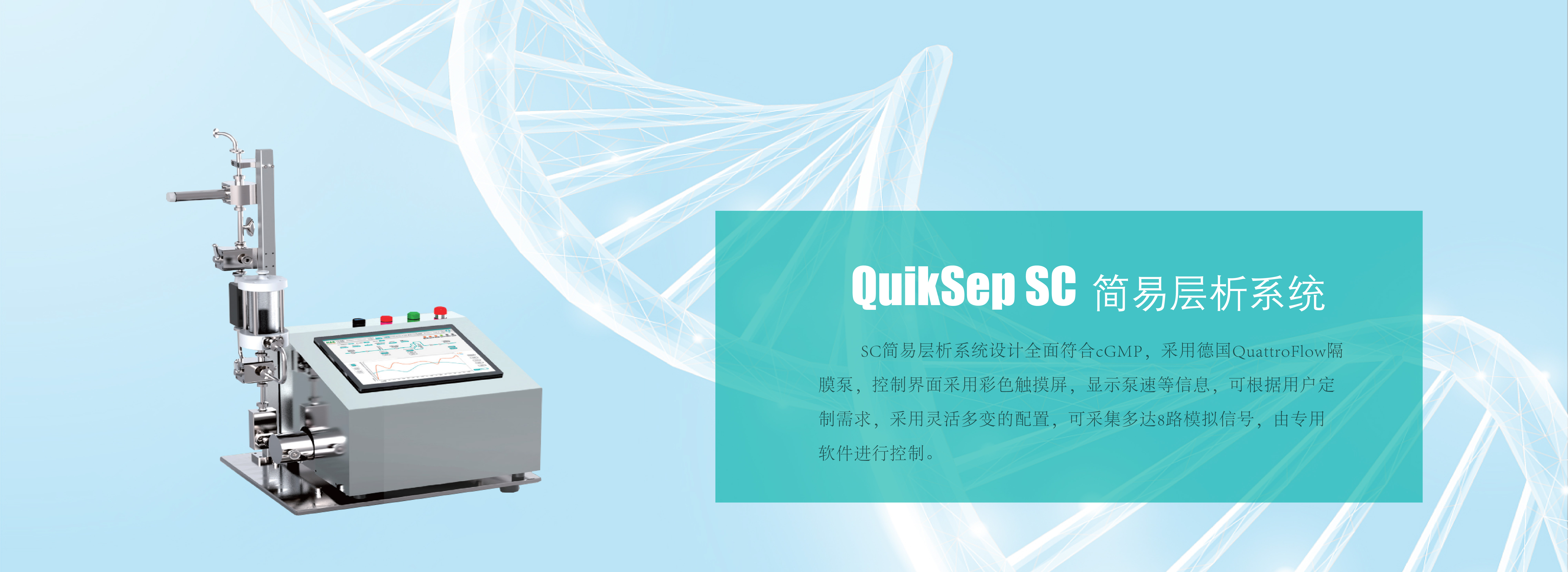 慧德易QuikSep SC簡易層析系統(tǒng)是采用衛(wèi)生級隔膜單泵設計,配合在線非接觸式超濾波流量計,可在線監(jiān)測流量、UV、電導、pH、壓力、溫度,手動柱位閥、氣泡陷阱閥為由衛(wèi)生閥門,是為中試和工業(yè)級生物制品純化而專門設計的層析系統(tǒng)