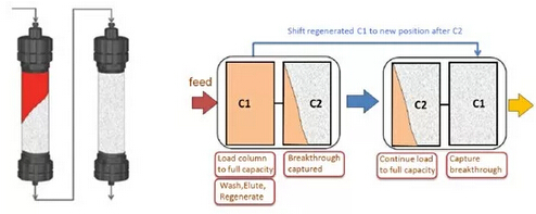 ? ? ? ?Capture SMB是將第一根層析柱的上樣流穿繼續(xù)上樣至第二根層析柱,待第一根層析柱完全滿載后,方結(jié)束其上樣,進行淋洗、洗脫等操作,而此時第二根層析柱仍在繼續(xù)上樣。通過切換柱位操作,保證2根層析柱的洗脫、再生、上樣等操作交替銜接進行,保證連續(xù)上樣,從而實現(xiàn)工藝與系統(tǒng)硬件設計的高度契合,使填料利用率最大化,用量大為縮減。
