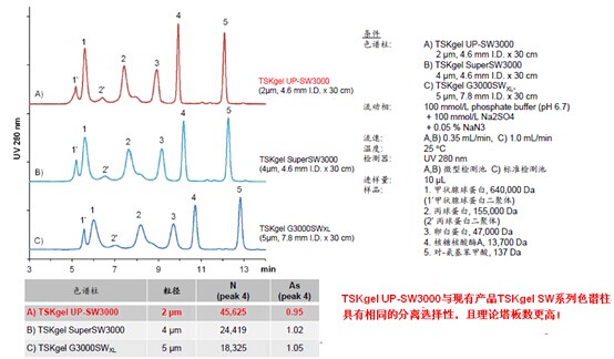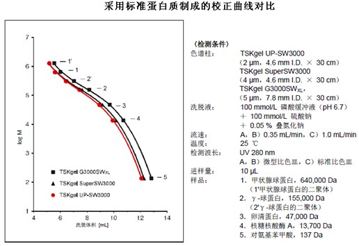 1.?對標準蛋白質的分離(與現有產品SW系列色譜柱的比較)