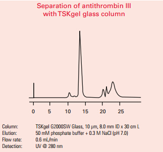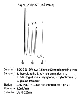 1. TSKgel SW-型填料由含二醇基官能團的剛性球形硅膠顆粒組成。