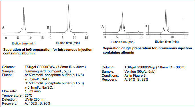 TSKgel G3000SWxl 凝膠過濾柱是全球公認的GFC法分析生物大分子的優質色譜柱,具備了孔體積/單位柱體積比高、樣品吸附低、柱效優異等優點,能夠使樣品獲得卓越的分離度。與其他競爭產品比較,該色譜柱單位柱體積的孔隙容量更大,能提高分子量選擇范圍并獲得更高的分辨率。 TSKgel G3000SWxl色譜柱填料的粒徑為5μm、孔徑為250? ,是分離蛋白和大分子多肽的極佳選擇。其分離范圍最高可分離500000 Da的球蛋白等生物大分子樣品。