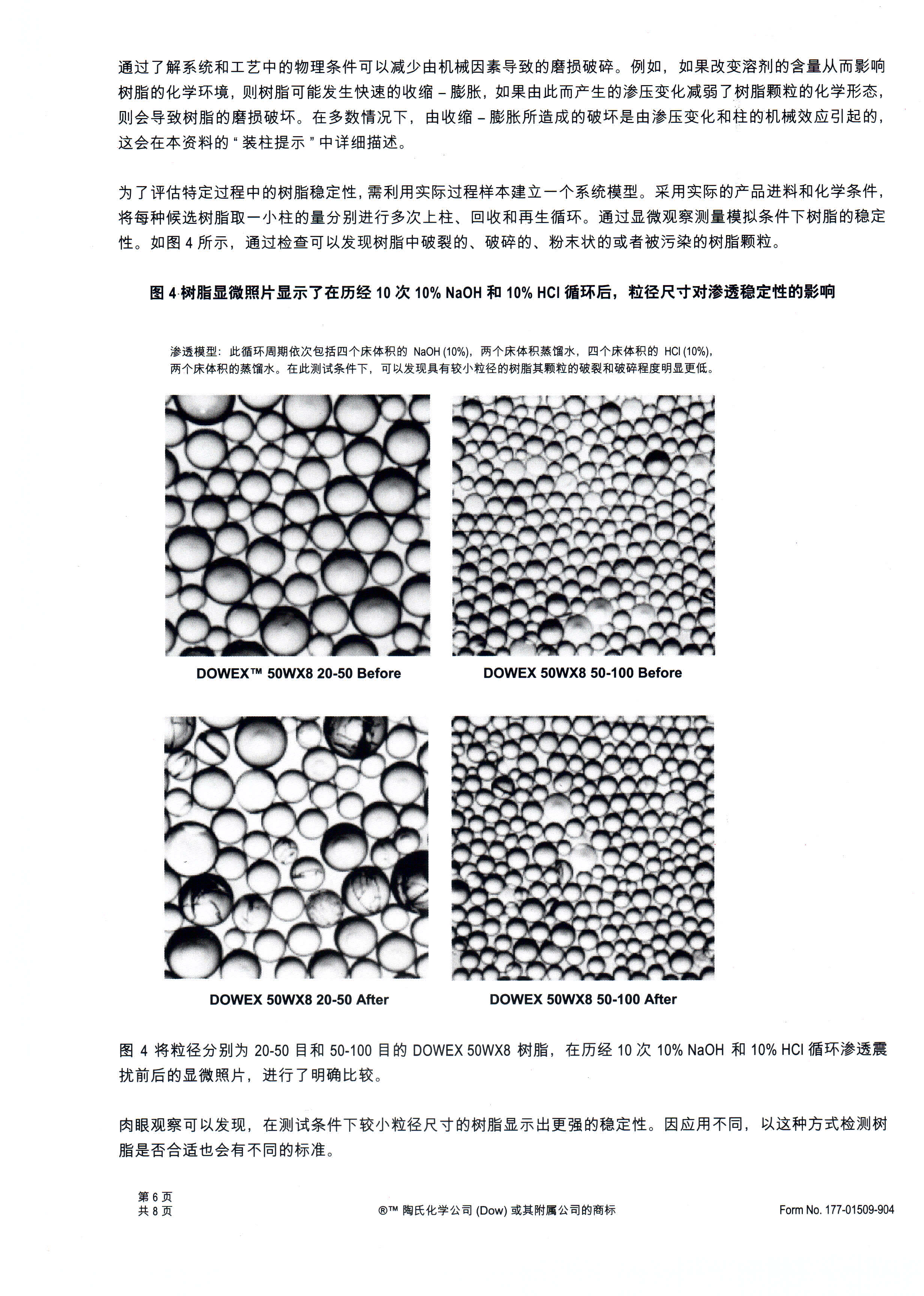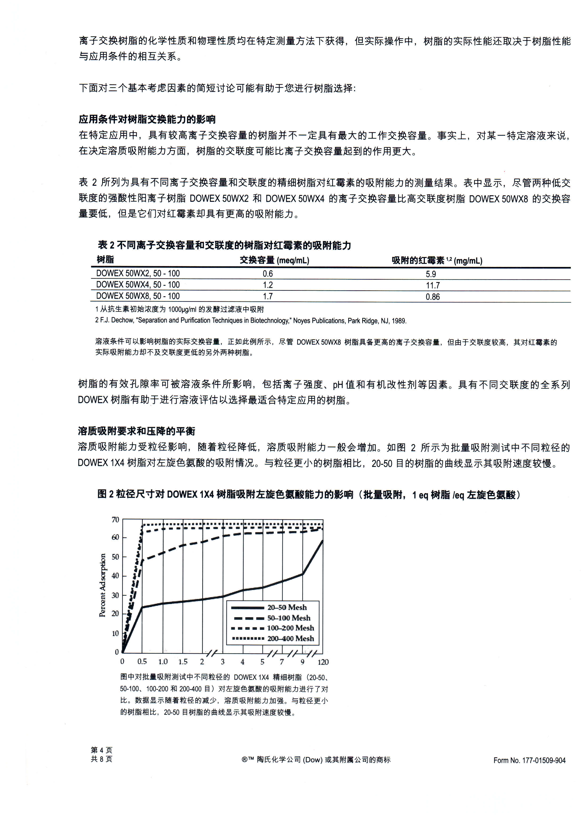 ?????? DOWEX系列離子交換色譜分離樹脂有強酸性陽離子交換樹脂和強堿性陰離子交換樹脂兩大類,每一類又根據交聯度(即DVB%)的不同劃分為3個小類,分別以“×2”、 “×4”與“×8”表示,在此基礎上進一步提供3個粒度范圍可供選擇,即150-300μm(50-100目)、75-150μm(100-200目)以及35-75μm(200-400目),共計18個樹脂牌號。顯然,不同交聯度的樹脂含水量不一,體積交換量、物質擴散的阻力各異,如此寬泛的產品范圍豐富了客戶的試用選擇,可以針對具體的應用優(yōu)選出適宜的色譜分離樹脂。