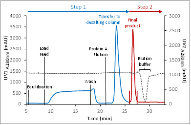 ??在該過程中,Protein A的洗脫組分不經過收集,而是在系統內直接上樣至脫鹽柱,兩步層析整合為一步,從而提高了純化效率。
