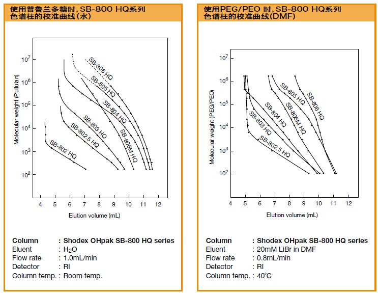 SB-804 HQ色譜柱是聚合物基質的水溶性SEC色譜柱,適用于各種分子量范圍的測定。溶劑可用DMF替換(除SB-802 HQ和SB-807 HQ以外),可分析極性聚合物。SB-804 HQ、SB-805 HQ可用于測定明膠的平均分子量。